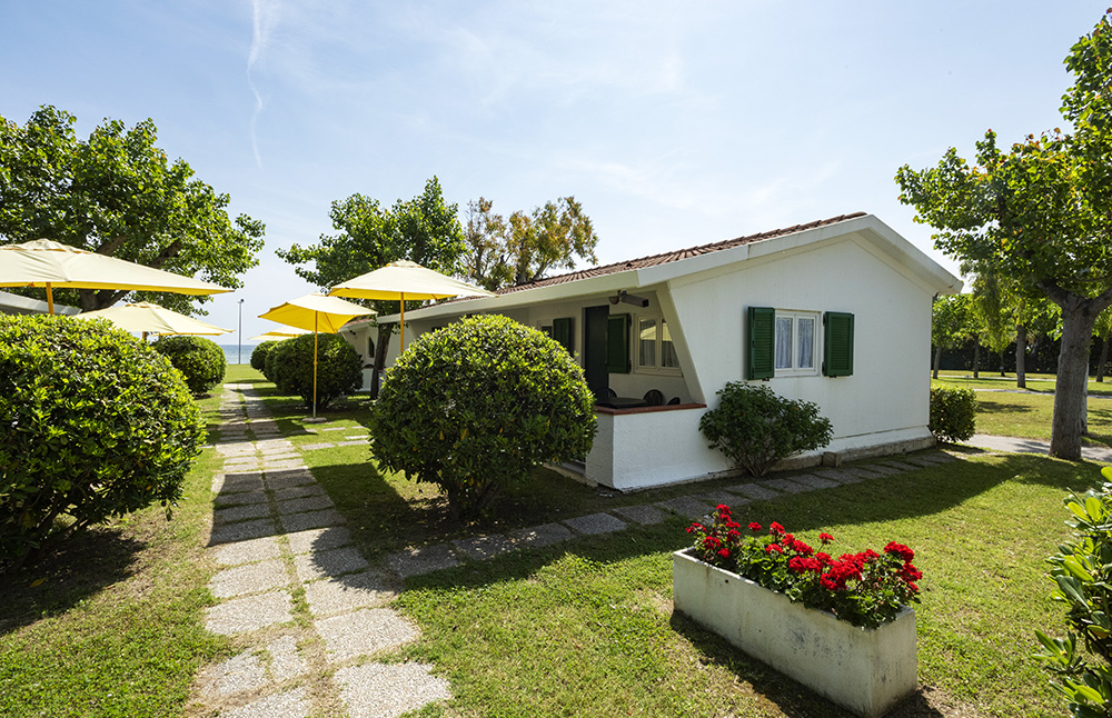I Bungalow in muratura sono in un'area riservata, tranquilla ed esclusiva, a due passi dalla spiaggia e dal mare. Le verande recintate arredate con tavolo e sedie offrono l'opportunità di godere pienamente il verde della natura ed i colori del mare. Il verde dei nostri alberi e il blù del nostro mare sono la cornice del nostro camping.